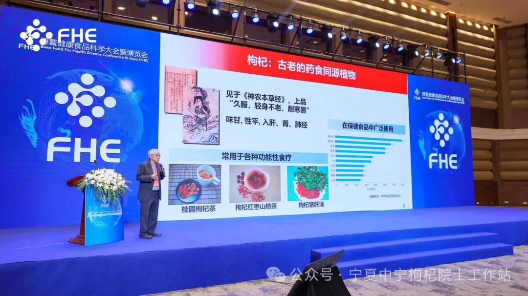 此外,中国科学院院士、暨南大学粤港澳中枢神经再生研究院院长苏国辉发表了题为《宁夏枸杞的科研与产业转化》的演讲。他详细介绍了宁夏枸杞在中医药领域的应用和研究成果,并强调了枸杞多糖等有效成分在青少年抑郁、帕金森和病毒预防乃至治疗等方面的潜在作用。